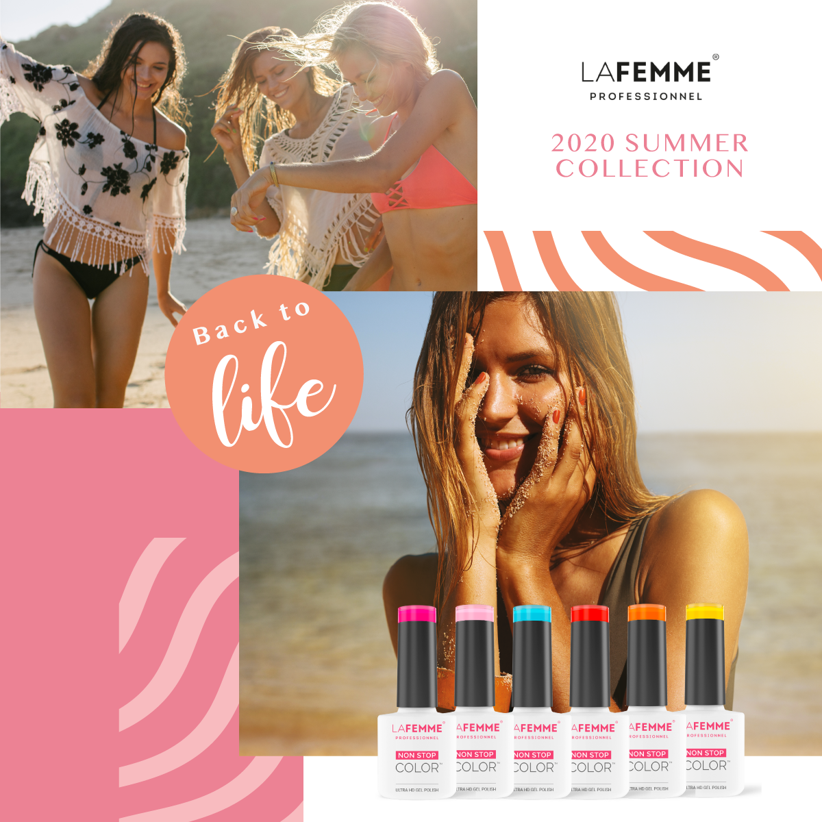 Back to Life è la nuova summer collection di Smalti Semipermanenti Ultra HD Non Stop Color™, una palette di carismatiche cromie rivolte ad una femminilità decisa: dal giallo vitaminico al rosso sensoriale passando per il blu etereo.