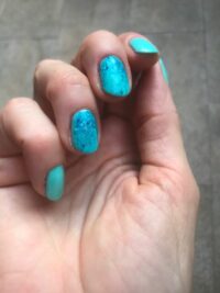 I glitter più luminosi che abbia mai visto: basta una sola passata sottile per illuminare un altro colore o una base. Con due passate l’effetto è stupendo, un azzurro semitrasparente ricco di riflessi.
