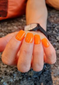 Uno dei colori più belli che abbia mai acquistato fino ad ora su questo sito . Tutti i loro colori sono pieni e coprenti già con la prima passata ma questo colore è davvero travolgente un arancio color spritz acceso poi con i brillantini sopra è ancora più scintillante . Lo consiglio !!!